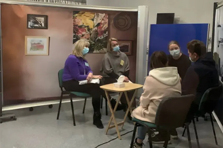 Photo: Participants experiencing a bereavement follow-up appointment scenario with actors playing the role of parents